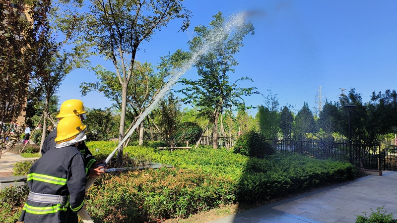 穿戴消防服及水帶連接階段,翔宇物業(yè)消防救援隊認真展示了消防服穿戴順序和消防水帶操作步驟,水槍拆裝操作細節(jié)等。